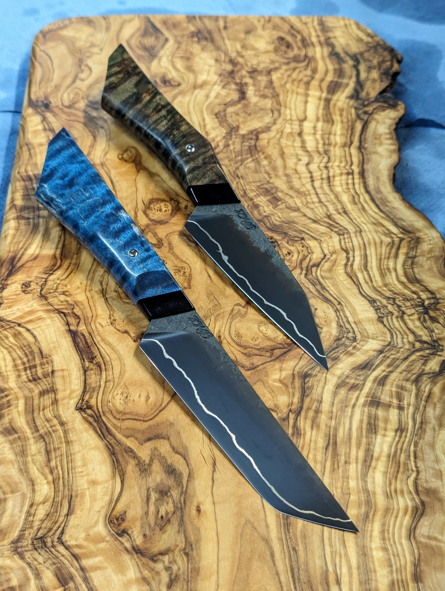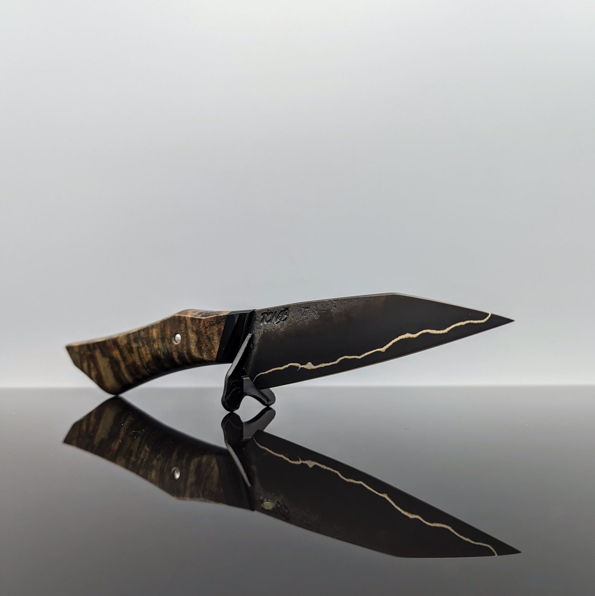 This is quite a unique steel, It is made up of three layers of 80crv2 carbon steel separated by copper and nickel. The overall look is similar to our dark-mai steel, but with burnt orange copper wrapping around the nickel layer, barely visible in photos. Perfect for general use and detail work, this is a lovely little paring knife will suit any kitchen.