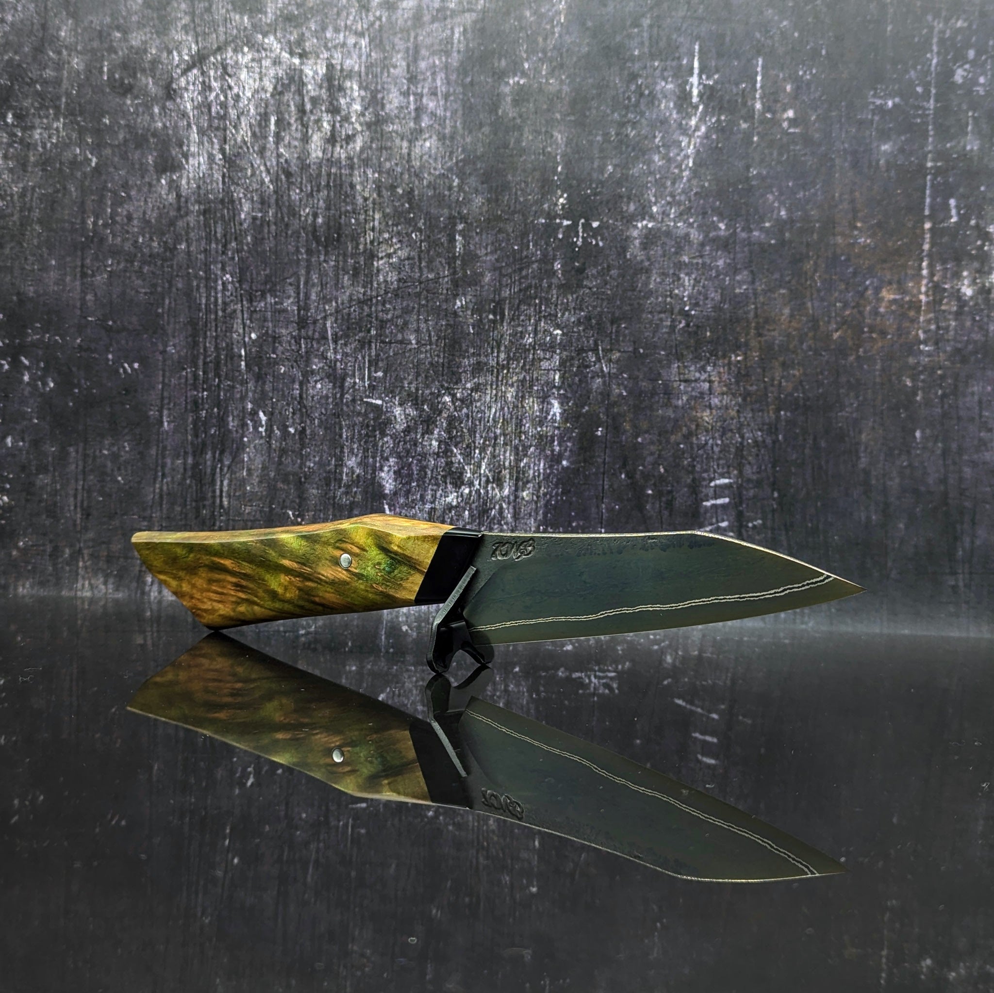 Perfect for general use and detail work, this is a lovely little paring knife will suit any kitchen. The double stripe san-mai is made up of 5 layers of steel and 4 layers of pure nickel, finished with a sunset version of our signature 'special black' finish.