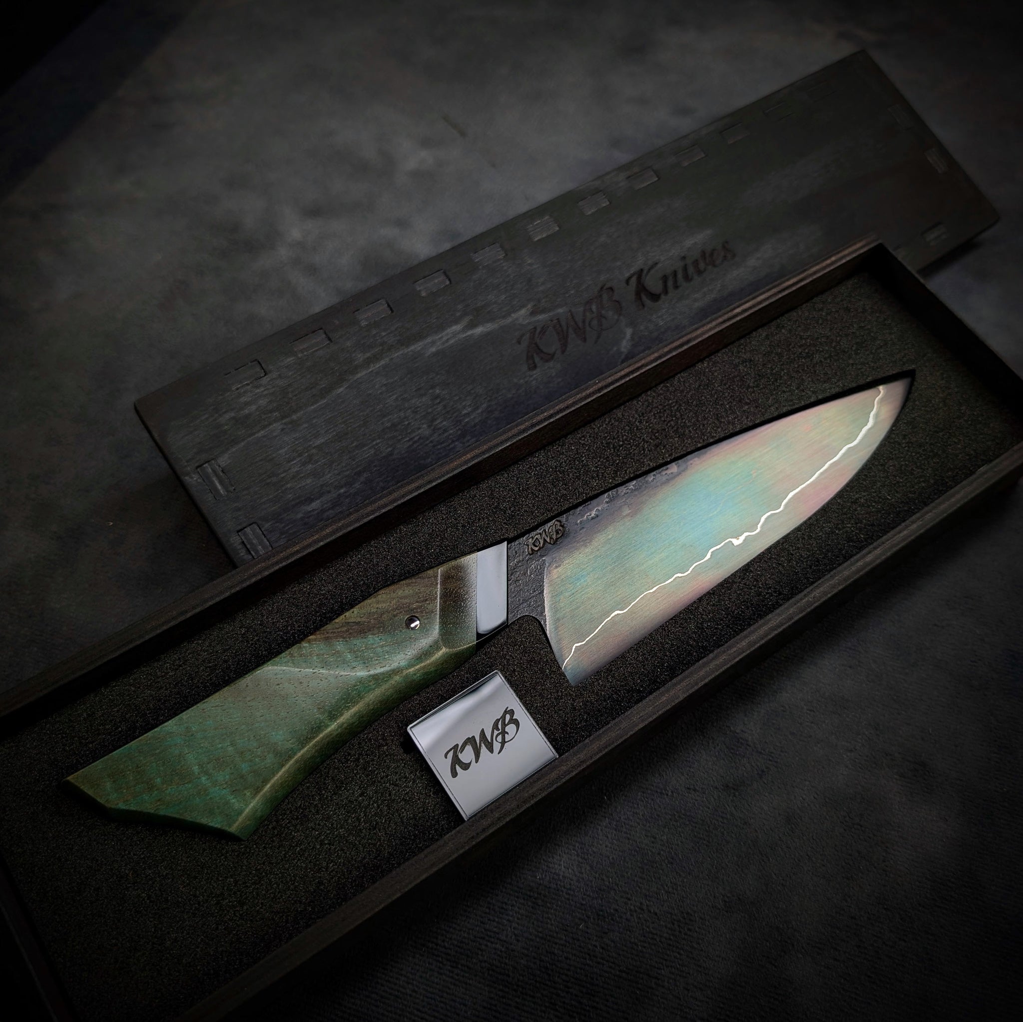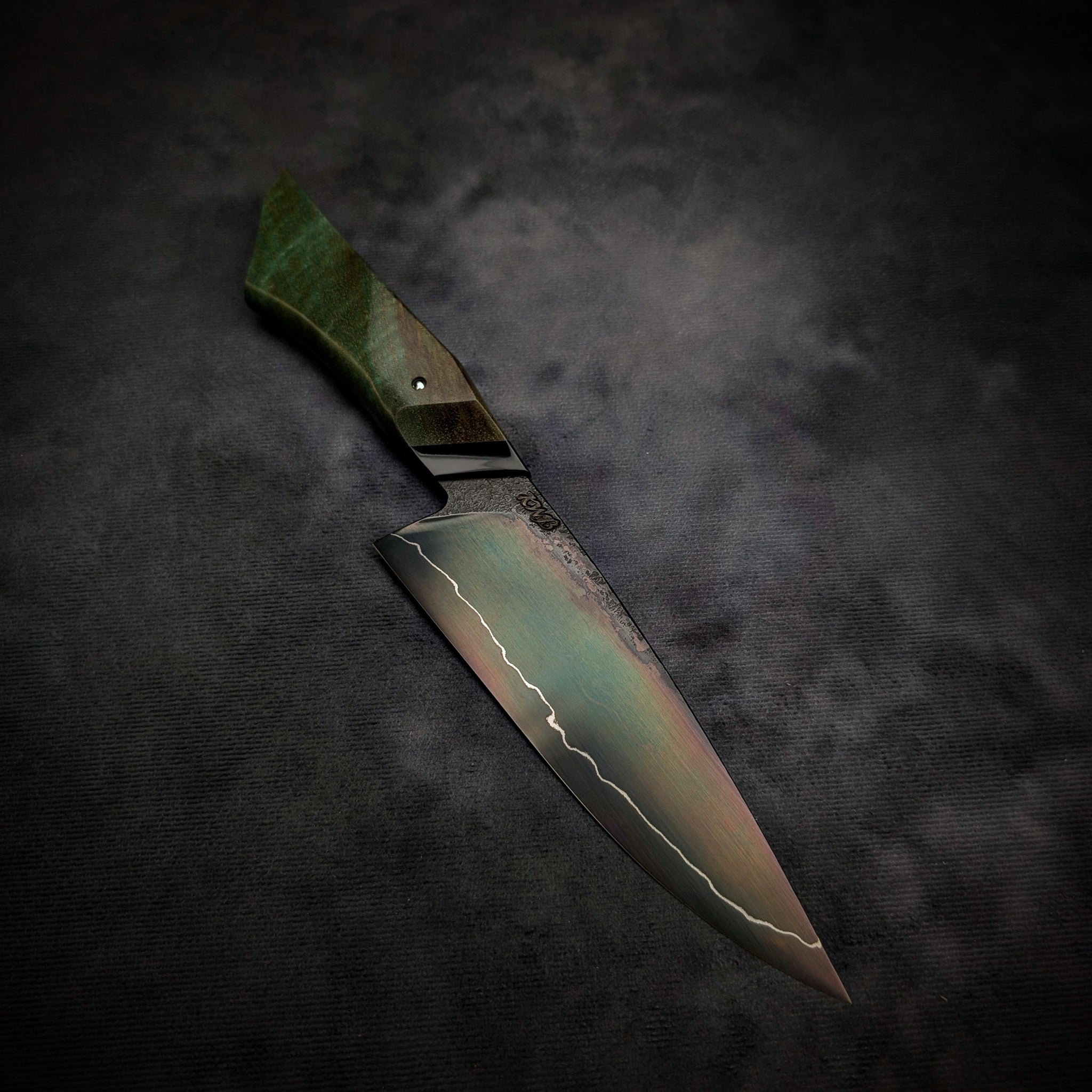 The colouring here is very dark, as the photos struggle to show. Almost black but with deep blue and purple tones. Some banding in the steel is visible in the patina bringing some red tones towards the center. Paired with a blue dyed walnut handle, shaped perfect for a pinch grip hold with the raised back and narrow front fitting the palm of the hand perfectly.
