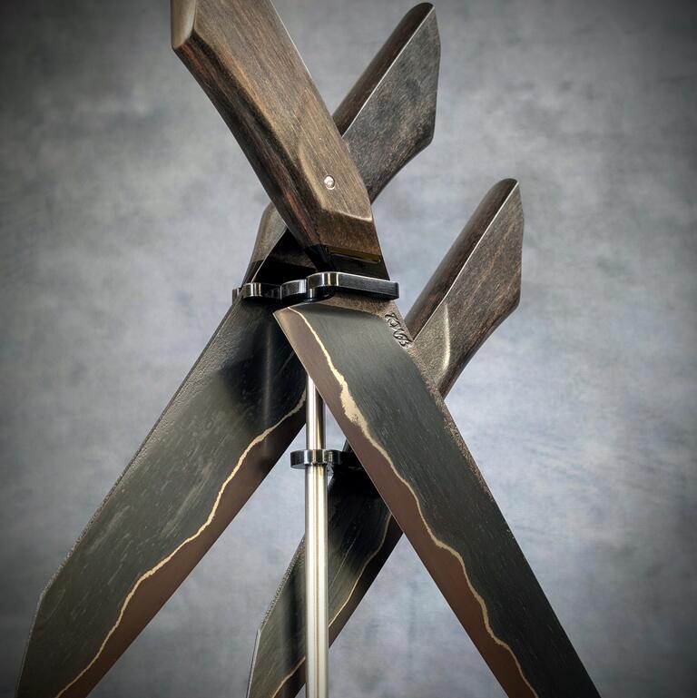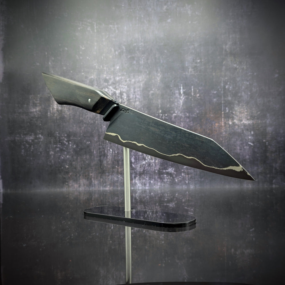 So rarely do you see a matching collection when it comes to handmade kitchen knives so this is a great opportunity to get a full collection and display centerpiece. Each knife is crafted for a specific purpose; the largest is a carving knife / chef knife crossover which is perfect for general purpose use. The long edge will allow for smooth slicing of larger bits of meat while the convex edge reduces friction and tearing. Then there's a santoku featuring a thinner edge for finer slicing of softer foods; potatoes and veg.. The pairing knife is of course the smallest in the set allowing for more delicate work or use on smaller chopping boards. All three have an ApexUltra cutting edge for the best cutting performance, with wrought iron cladding for a touch of class and history, as well as looking rather spectacular with that wood grain pattern.