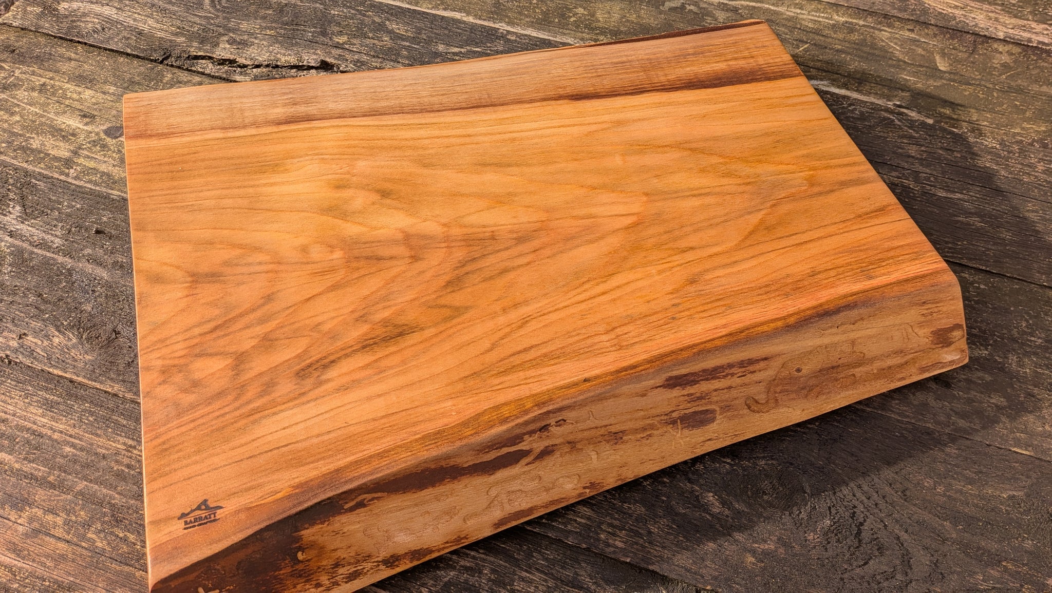 This substantial Cherry hardwood chopping board exhibits a robust construction and a deep amber color. The cutting surface measures 52cm in width, 38cm in depth (at the deepest point), and has a thickness of 4cm. Integrated rubber nonslip feet enhance stability during use. The durable hardwood composition ensures longevity, while the spacious cutting area facilitates efficient meal preparation, allowing for the handling of larger ingredients with ease.