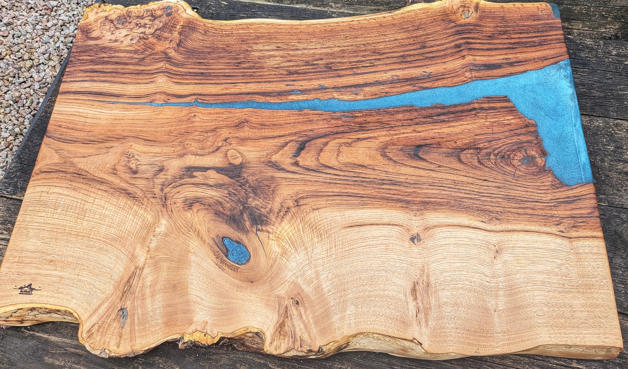 A substantial chopping board measuring 80cm in width and approximately 56cm in depth. The board features a visually appealing blue food-safe resin contrasted against a dark mottled chestnut timber, serving as an eye-catching centerpiece.