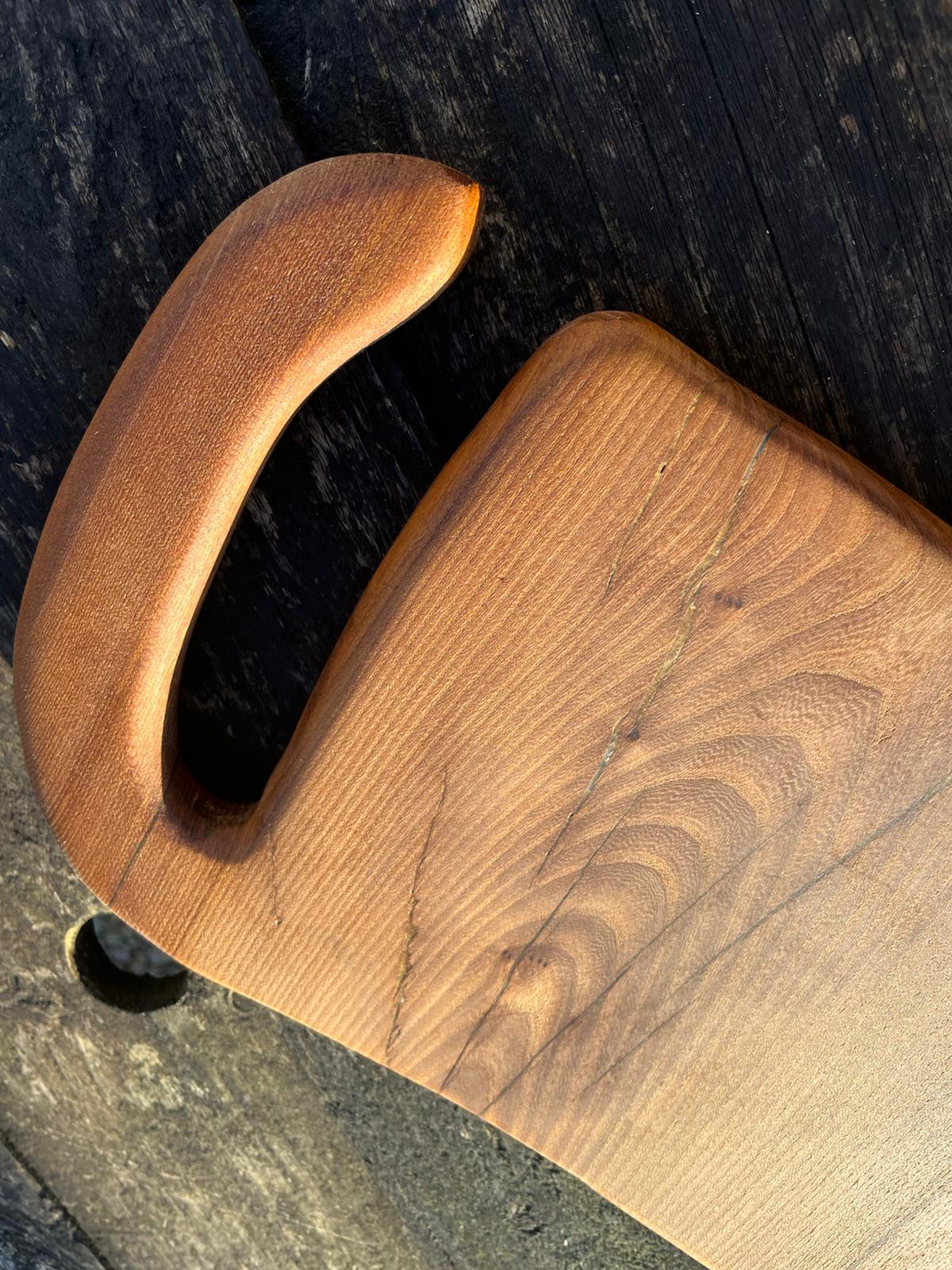 Small elm with a lot of options for uses; charcuterie board, cheese board or regular uses kitchen chopping board. Bronze food safe resin details in line cracks across the grain of the board. Beautiful golden grain and handle to allow for hanging display.