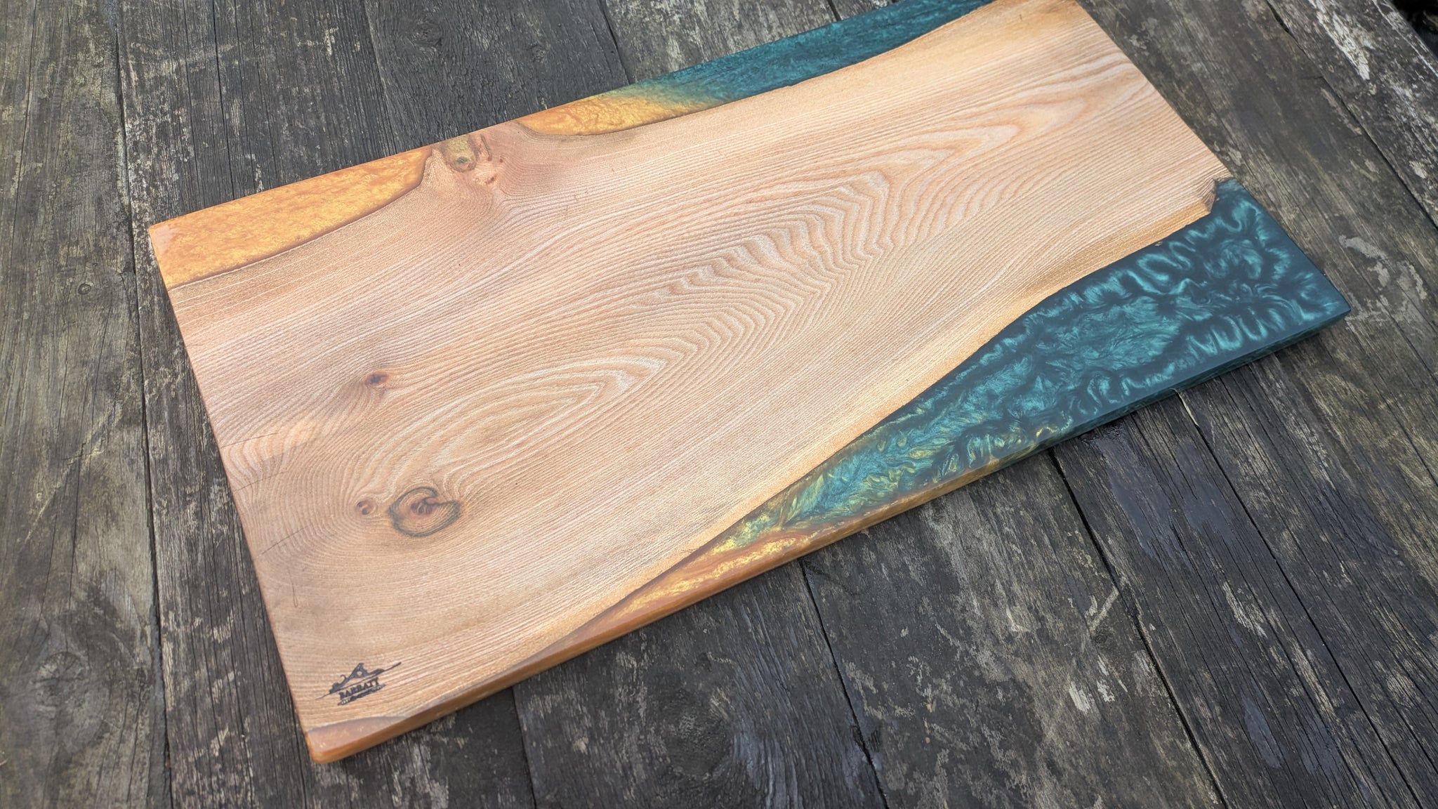 Demand attention for your food with this striking and colourful serving board made with British Elm and food-safe resin.
