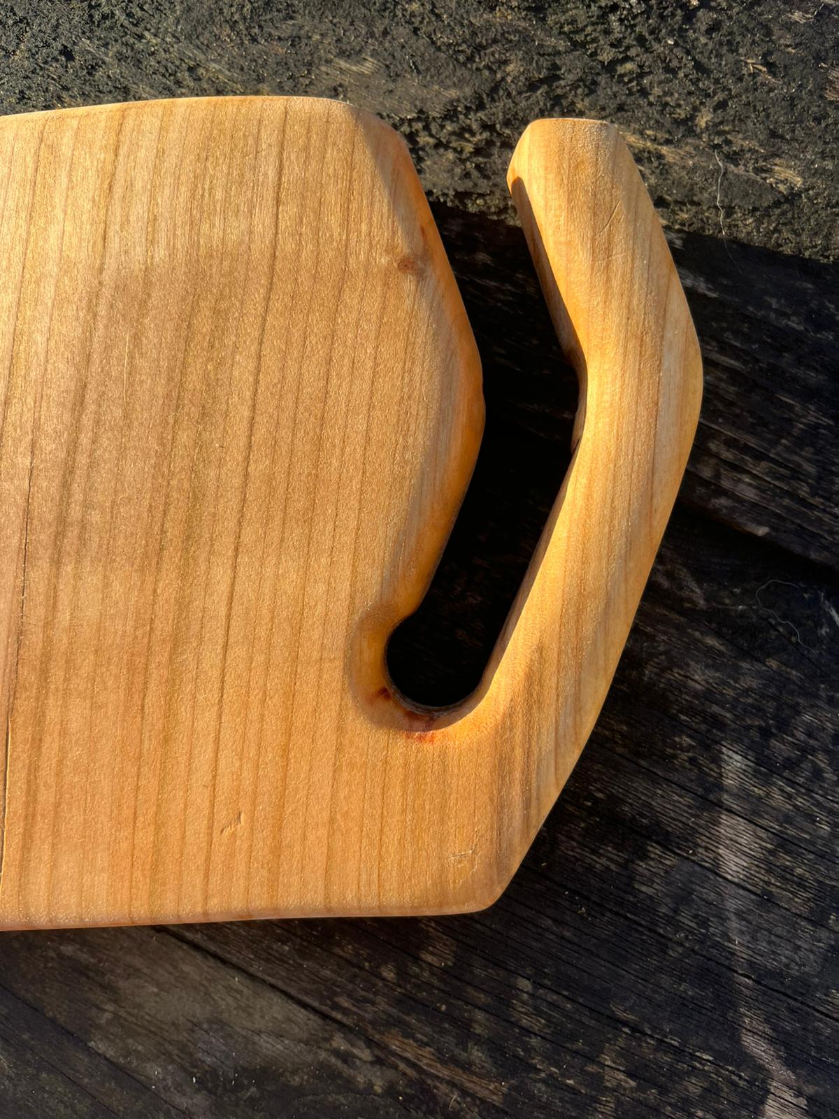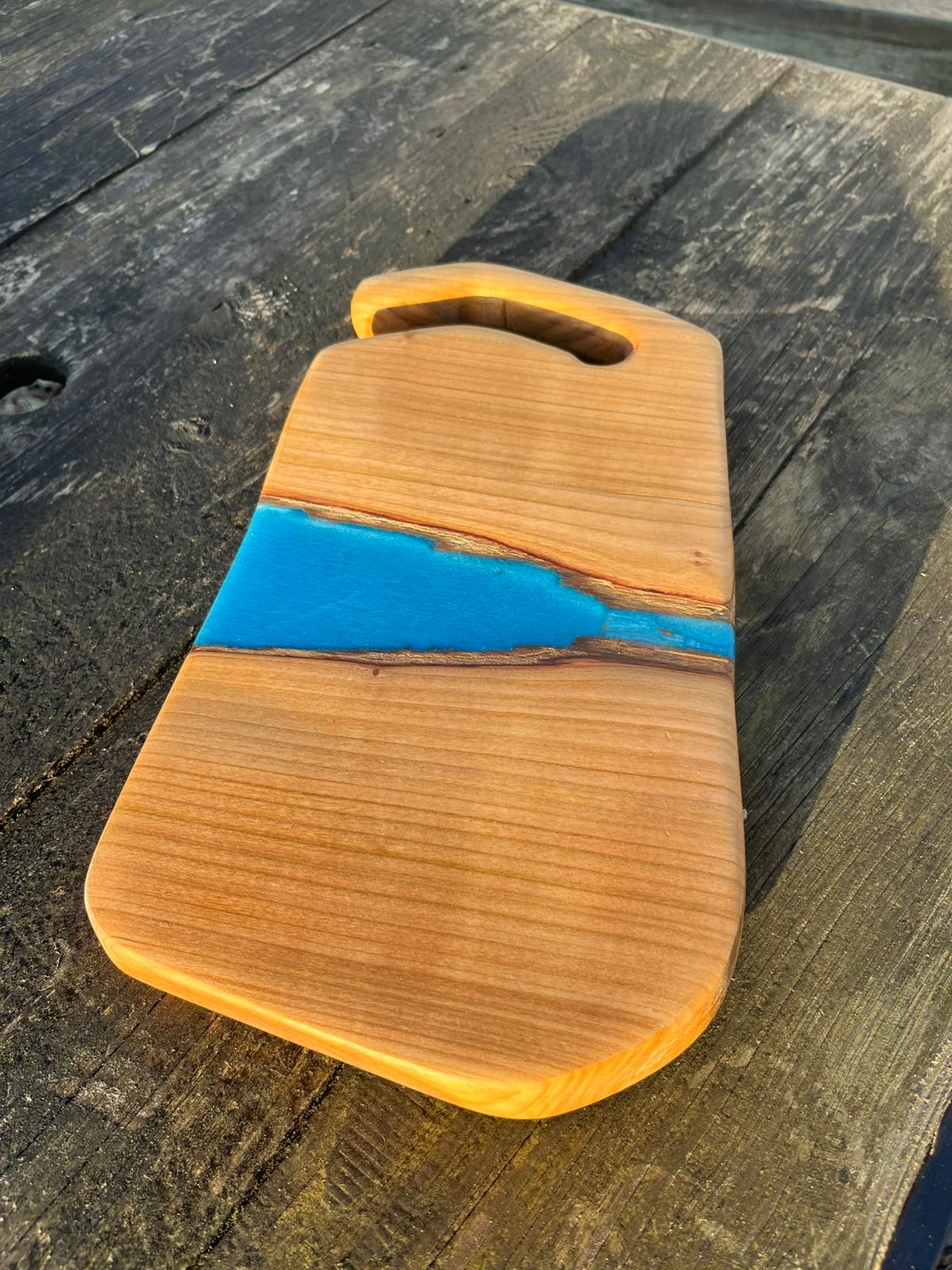 Fun and striking blue food safe epoxy river runs through this small Cherry serving or chopping board. This board come with a useful handle which aid its ability to be a hanging display piece or stored effectively. Small but striking this boards screams hand crafted.
