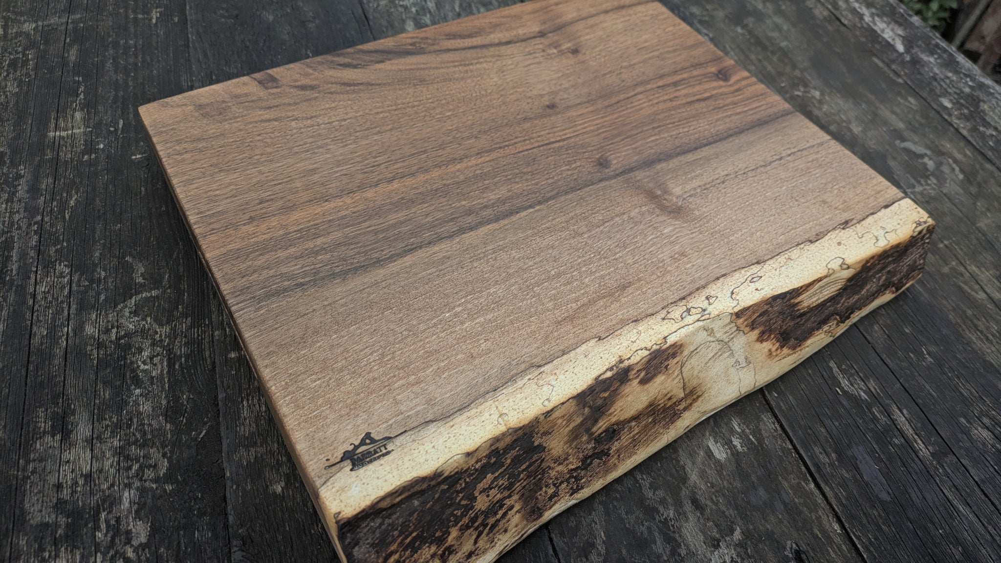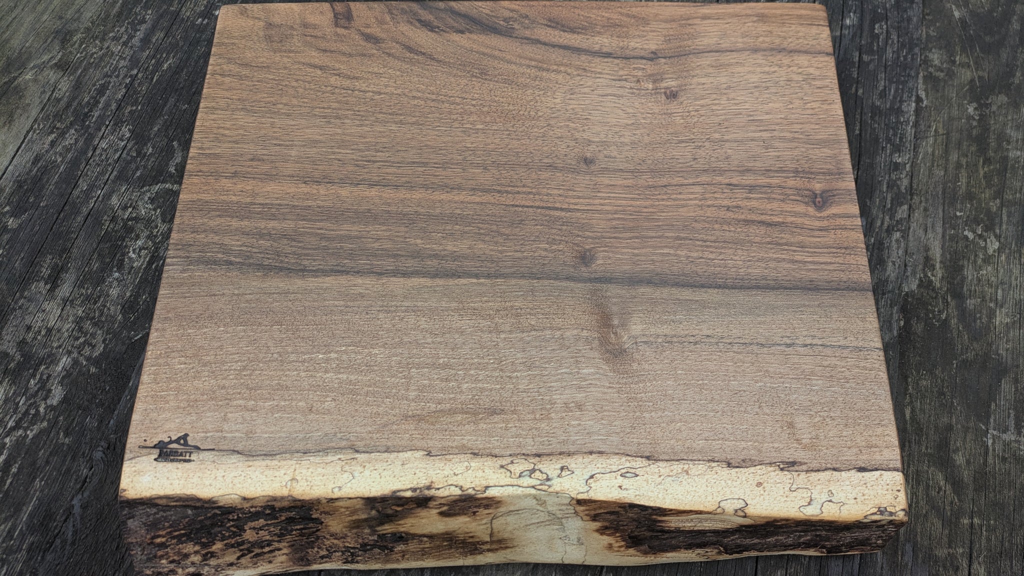 Crafted from premium English walnut, this chopping board showcases a rich, dark grain complemented by a unique mottled live edge that adds character to any kitchen setting. Its substantial dimensions—40cm wide, 32cm deep, and 4.5cm thick—provide a generous, sturdy surface ideal for a variety of culinary tasks. Finished meticulously with mineral oil and beeswax, the board boasts a protective, food-safe coating that enhances the wood’s natural beauty while ensuring durability and resistance to moisture. Designed for chefs who appreciate both function and aesthetics, this board combines robust performance with elegant design.